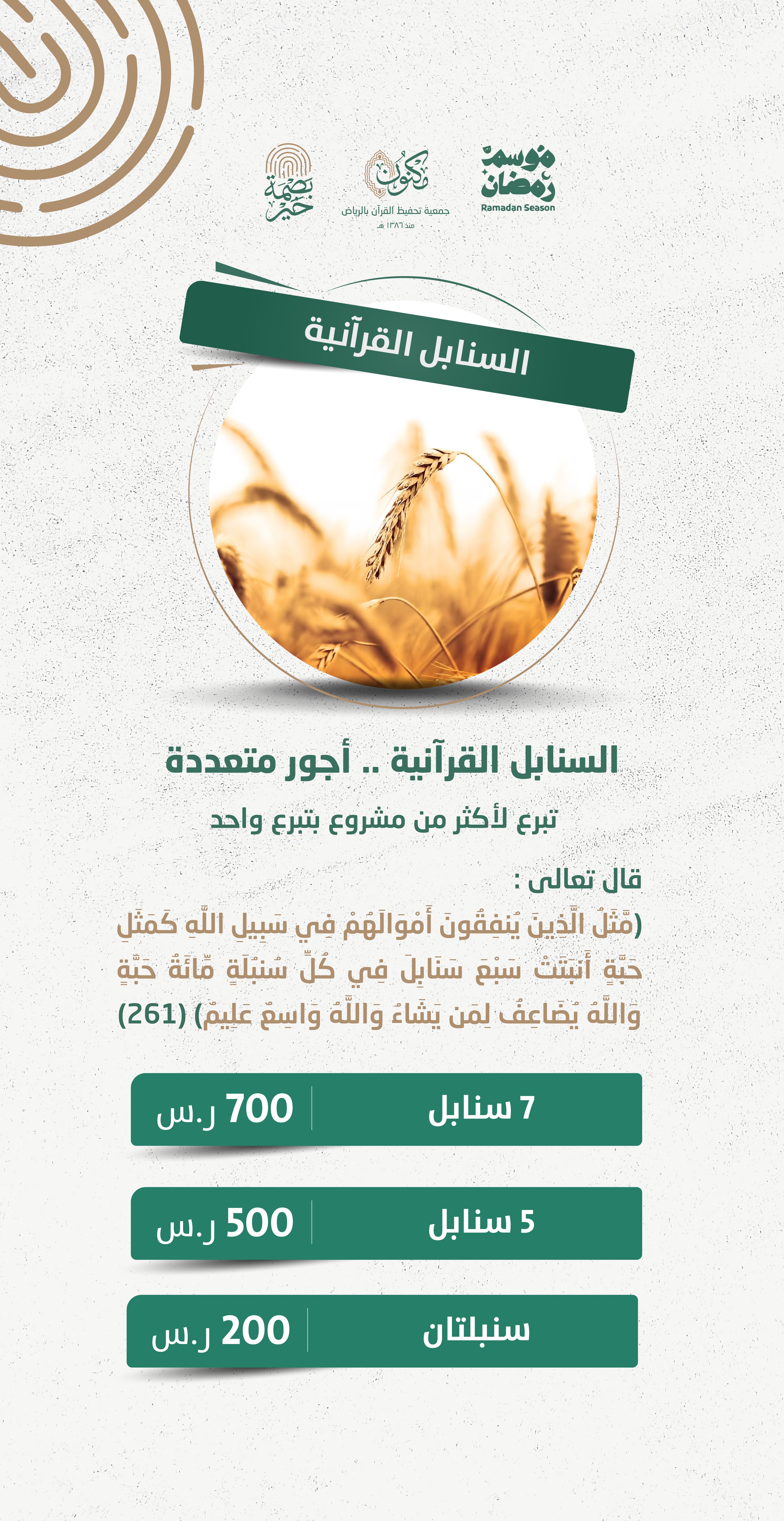 السنابل القرآنية .. أجور متعددةيهدف المشروع لإتاحة التبرع لأكثر من مشروع بتبرع واحدقال تعالى : (مَّثَلُ الَّذِينَ يُنفِقُونَ أَمْوَالَهُمْ ف...